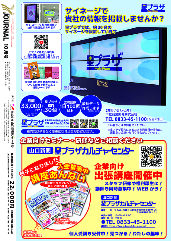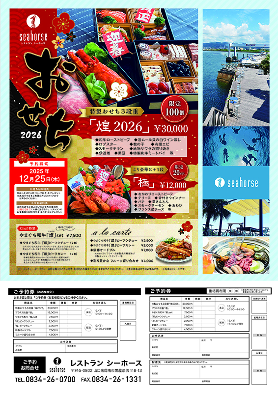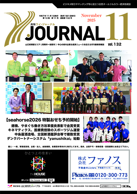 既刊一覧(バックナンバー) vol.132 2025年11月号 (全20頁) 【seahorse2026特製おせち予約開始】 徳機、やまぐち働き方改革優良表彰で金賞受賞キネマティクス、医療費控除のスポーツジム運営中島屋酒造場、全国新酒鑑評会等で複数受賞 ダンクパートナーシステム、「yanushikai」始動 ほか vol.131 2025年10月号 (全20頁) 【山一電設、動物園の新ユニ作成で寄附】 あおき、ジャパンフードセレクションで金賞獲得西京銀行、農業問題解決で資本業務提携締結周南公立大学、情報系専門職大学院の設置認可 巽設計コンサルタント、ペルー人技術研修員受入 ほか vol.130 2025年9月号 (全20頁) 【光市と日本公庫、産業振興で協定締結】 周南公立大学、日本一の地域貢献大学目指すフィットネスリープ、元日本王者が運動をサポートダスキンせらいの想い、「幸せの花咲か村」宣言 明治安田、ACTSAIKYO田口真彩選手を支援 ほか vol.129 2025年8月号 (全20頁) 【リュウト、斬新かつ革新的な新工場拠点】 安本建設、省エネ高気密断熱の分譲モデルハウス徳山コーヒーボーイ、特別賞〈コンテンツ賞〉受賞下松デンタルアカデミー専門学校、集団歯科健診 維新、介護離職を防ぐ新しい取り組み ほか vol.128 2025年7月号 (全28頁) 【2025(令和7年度)暑中見舞広告特集】 福島由美氏、Beauty Japan山口広島大会へ三基商会、インギングスポーツを全面サポート県内企業が協賛、eスポーツ&デジタル人材育成講座 キチナンG、周南公立大学に寄附金贈呈 ほか vol.127 2025年6月号 (全24頁) 【居酒屋いっぷくBBQビアガーデン開催中】 西京銀行25年3月期決算、5期連続過去最高益訪問看護事業Noah、洗練された新本社オフィス囲新プロジェクト、囲碁漫画「ヒカルの碁」寄贈 明治安田徳山支社、岩国YMCAと連携協定締結 ほか vol.126 2025年5月号 (全24頁) 【平生港で港湾運送事業担う平生港運】 西部ビルメン、俳優の松林さんラッピング車両三和テクノイノベ、周南初の社会人硬式野球チームはつもみぢ6年振り入社式、初の県外出身者2名 巽設計、県内唯一の5年連続ブライト500認定 ほか vol.125 2025年4月号 (全24頁) 【西京イノベーションファンド11社参加】 山口県民共済、4市新小学1年生に防犯ブザーインギング、2025年参戦体制発表第33回林忠彦賞に鶴巻育子氏「ALT(オルト)」 周防大島町の貸別荘施設「大島ビーチファミリ-」 ほか vol.124 2025年3月号 (全24頁) 【下松の偉人讃える関係者が東京集結】 高山石油グループ、5年ぶり盛大に賀詞交歓会宝計機製作所、電子化計量器開発でモノづくり追求九内、下松市内2施設のネーミングライツ取得 蛇島開発、採石場利用の爆破体験を新規事業化 ほか vol.123 2025年2月号 (全24頁) 【光市梅まつり&ちどりダイニング】 オフィスドラッグ、新薬局を山口市内に初開設ネストハウス、複合施設イロハーブをリニューアル光運送、若者や女性が働きやすい職場環境構築 周南造園、大自然満喫型のオートキャンプ場を整備 ほか vol.122 2025年新春1月号 (全28頁) 【2025年度新春年賀広告特集】 周南に最新トレンドショップ「DECK PLAZA」光メタルセンター、事業拠点再編で主力工場増強サン・リフォーム、シャトレーゼ5店舗化FC運営 「サープラ下関長府あそびタウン」グランドオープン ほか vol.121 2024年12月号 (全24頁) 【HARADA、ユニフォーム「E+」活動PR】 中国NBC山口支部主催の講演会に180名下松商業開発、三市一町交流記念三酒ギフト周南市の西田事務所、「TOP100 2024」受賞 シーパーツ、山口県立大生と創業70周年祭祝う ほか